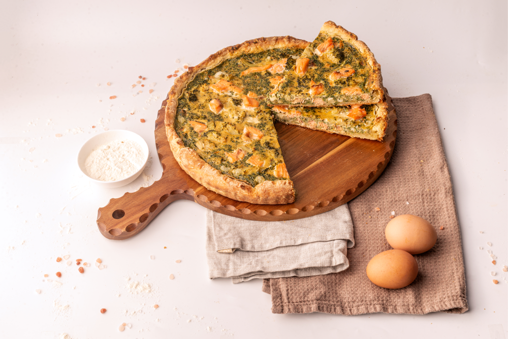 Тесто рассыпчатое, сёмга, брокколи, шпинат, заливка молочно‑яичная