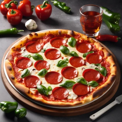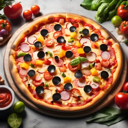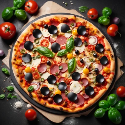 Курица, болгарский перец, моцарелла, шампиньоны, форменный томатный соус
